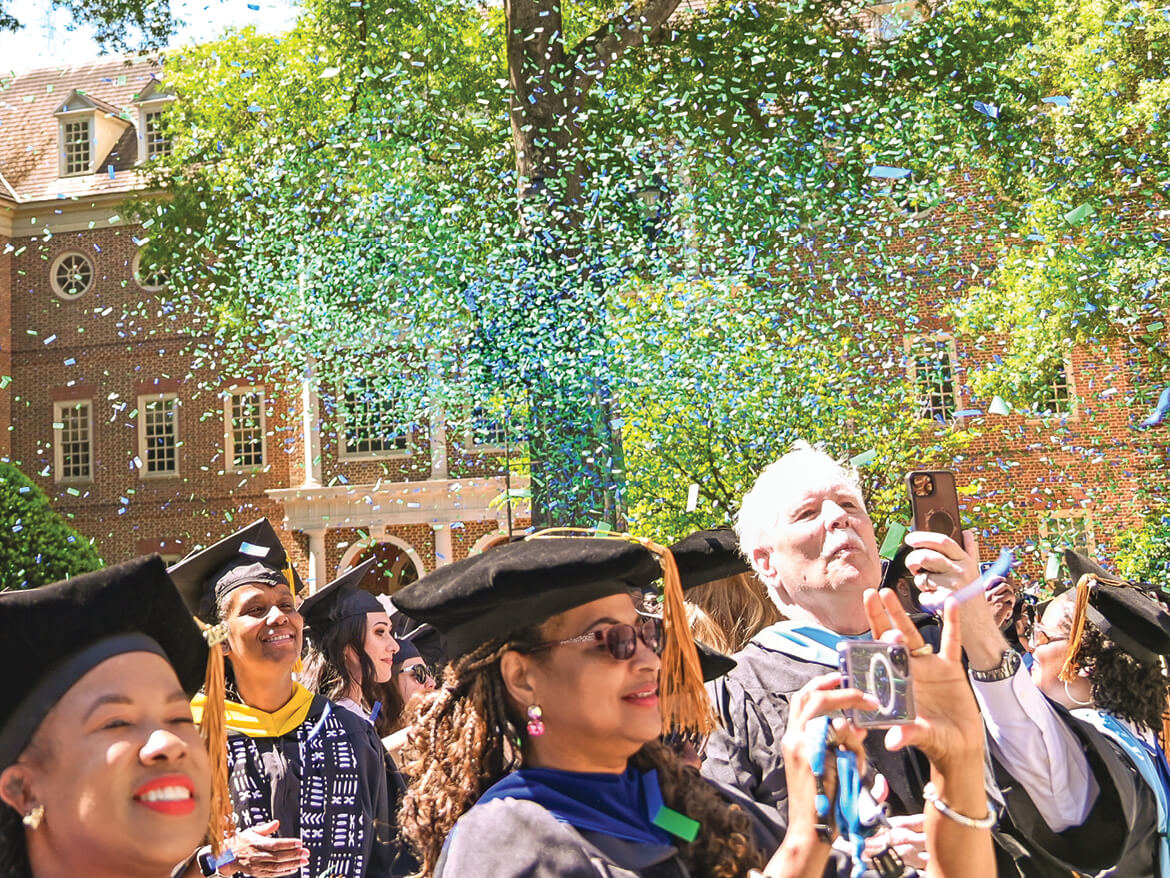 Before the conferring of degrees, Robertson shared his “Chancellor’s Charge” with the Class of 2025. Then came the highly anticipated moment—graduates were invited to “turn their tassels,” followed by an explosion of blue and green confetti over the Library Plaza.