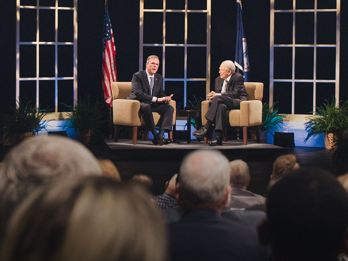 On Friday, October 23, Regent welcomed Republican presidential hopeful and former Florida governor Jeb Bush to campus for the university’s first Presidential Candidate Forum. He joined chancellor, founder and CEO Dr. M.G. “Pat” Robertson in the Regent Theatre for a stump speech, a one-on-one interview with the longtime 700 Club host and an audience question-and-answer session.